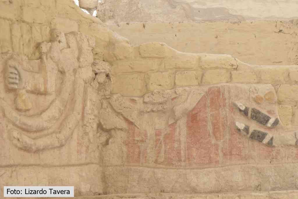 Aprovechando el gran corte de la fachada sur se ubicó un friso que estaría decorando un muro de un metro de espesor en el Patio Ceremonial en la cima correspondiente a la etapa constructiva conocida como Edificio D. El motivo representado es posiblemente un pez "Life" (Trichomyc terus sp.) representado como un dibujo de un ser con cuerpo largo y cabezas en ambos extremos ordenados dentro de paneles diagonales de 1.46 metros de ancho. Otro friso decorativo en el mismo Patio Ceremonial se hizo sobre el muro norte, allí se repite el mismo motivo pero en paneles verticales. Los colores usados son el amarillo, rojo, blanco, gris y negro (Franco, Gálvez y Murga 2002).