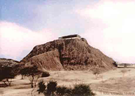 Pirámide en Túcume. Al frente, rampa de acceso a la parte superior del edificio. Se puede notar los múltiples canales formados por la erosión causados por la abundante lluvia que cae en esa parte de la costa peruana.